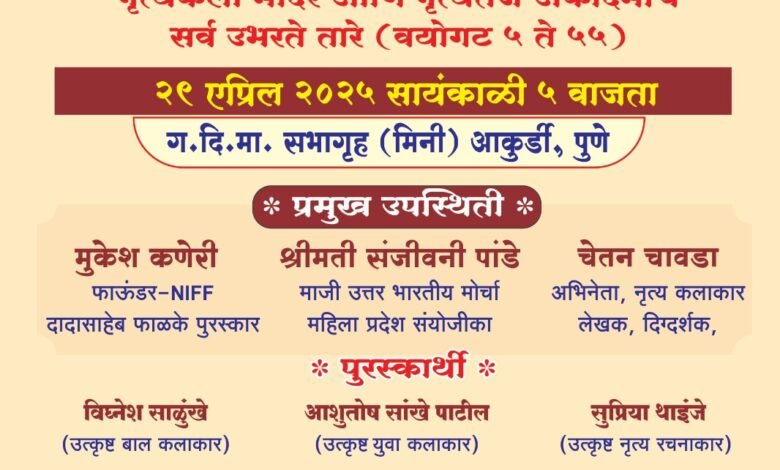 पिंपरी(प्रतिनिधी) जागतिक नृत्य दिनानिमित्त निगडी येथील नृत्य कला मंदिर आणि नृत्य तेज कला अकॅडमी च्या वतीने उदया दि. २९ रोजी पुरस्कार सोहळ्याचे आयोजन करण्यात आले असल्याची माहिती तेजश्री अडिगे यांनी दिली