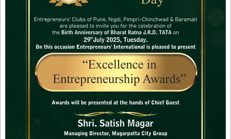 पिंपरी (प्रतिनिधी) आंत्रप्रेन्युअर्स इंटरनॅशनलच्या वतीने भारतरत्न जेआरडी टाटा यांच्या जयंती निमित्त औद्योगिक क्षेत्रात उल्लेखनीय कार्य करणाऱ्या उद्योजकांना उत्कृष्ट उद्योजक पुरस्कर प्रदान करण्यात येणार असल्याची माहिती आंत्रप्रेन्युअर्स इंटरनॅशनलचे अध्यक्ष अमोल जाधव यांनी प्रसिद्धी पत्रकाद्वारे दिली आहे.
